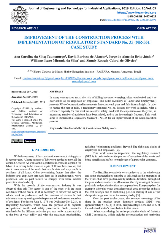 IMPROVEMENT OF THE CONSTRUCTION PROCESS WITH IMPLEMENTATION OF REGULATORY STANDARD No. 35 (NR-35): CASE STUDY