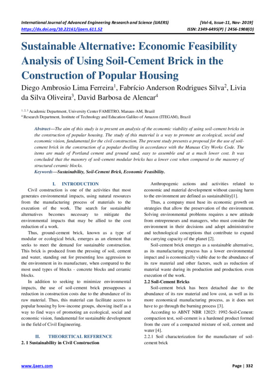 Sustainable Alternative: Economic Feasibility Analysis of Using Soil-Cement Brick in the Construction of Popular Housing