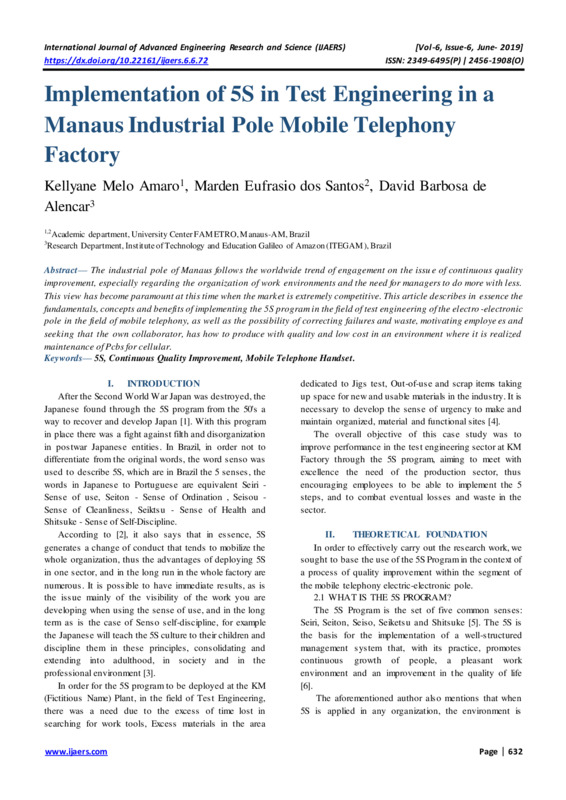 Implementation of 5S in Test Engineering in a Manaus Industrial Pole Mobile Telephony Factory