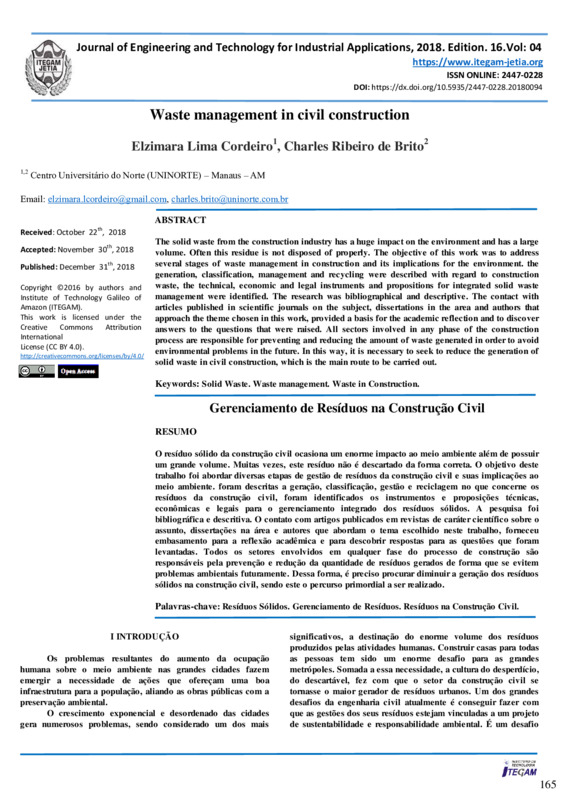 Keywords: Solid Waste. Waste management. Waste in Construction.