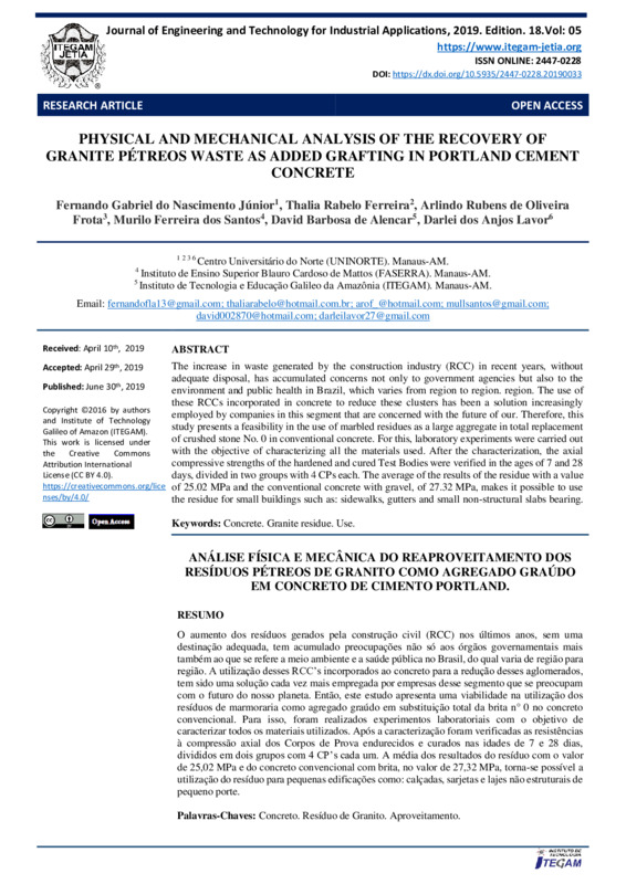 RCH ARTICLE OPEN ACCESS PHYSICAL AND MECHANICAL ANALYSIS OF THE RECOVERY OF GRANITE PÉTREOS WASTE AS ADDED GRAFTING IN PORTLAND CEMENT CONCRETE