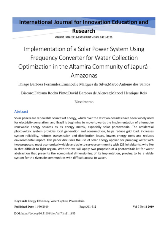 Implementation of a Solar Power System Using Frequency Converter for Water Collection Optimization in the Altamira Community of Japurá - Amazonas