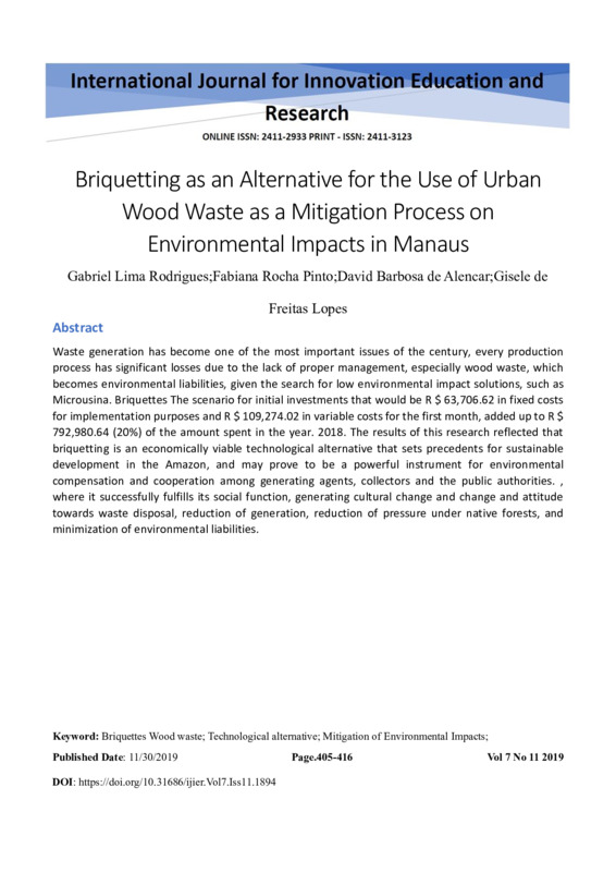 Keyword: Briquettes Wood waste; Technological alternative; Mitigation of Environmental Impacts;
