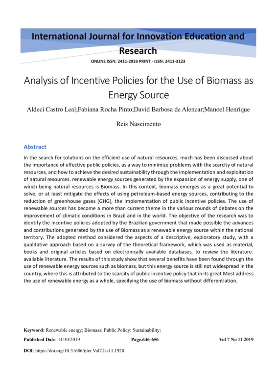Keyword: Renewable energy; Biomass; Public Policy; Sustainability;
