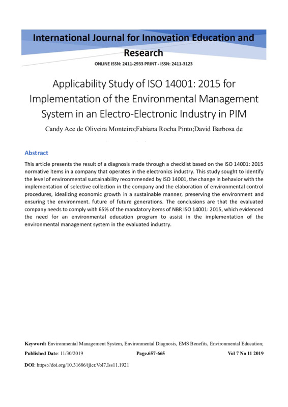Applicability Study of ISO 14001: 2015 for Implementation of the Environmental Management System in an Electro-Electronic Industry in PIM