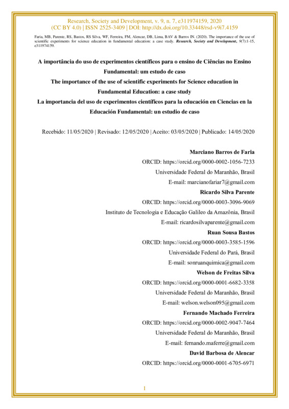 Palavras-chave: Ensino de Ciências; Experimentos; Ensino Fundamental; Ensino