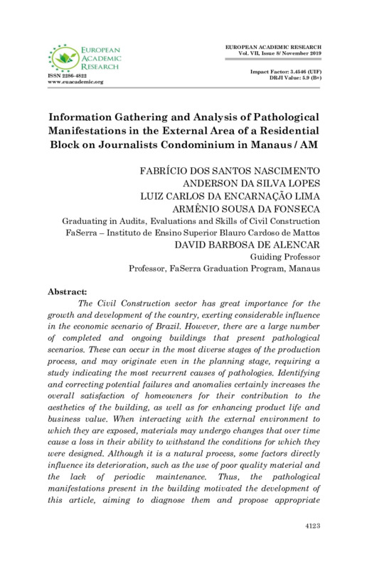 Information Gathering and Analysis of Pathological Manifestations in the External Area of a Residential Block on Journalists Condominium in Manaus / AM