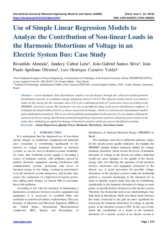 Use of Simple Linear Regression Models to Analyze the Contribution of Non-linear Loads in the Harmonic Distortions of Voltage in an Electric System Bus: Case Study