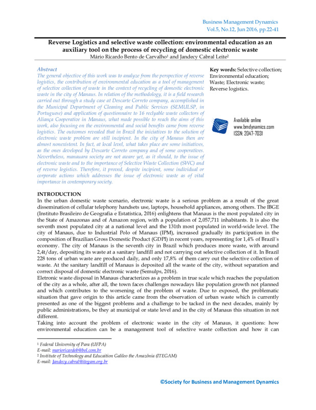 Reverse Logistics and selective waste collection: environmental education as an auxiliary tool on the process of recycling of domestic electronic waste