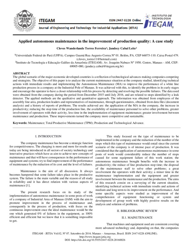 Applied autonomous maintenance in the improvement of production quality: A case study