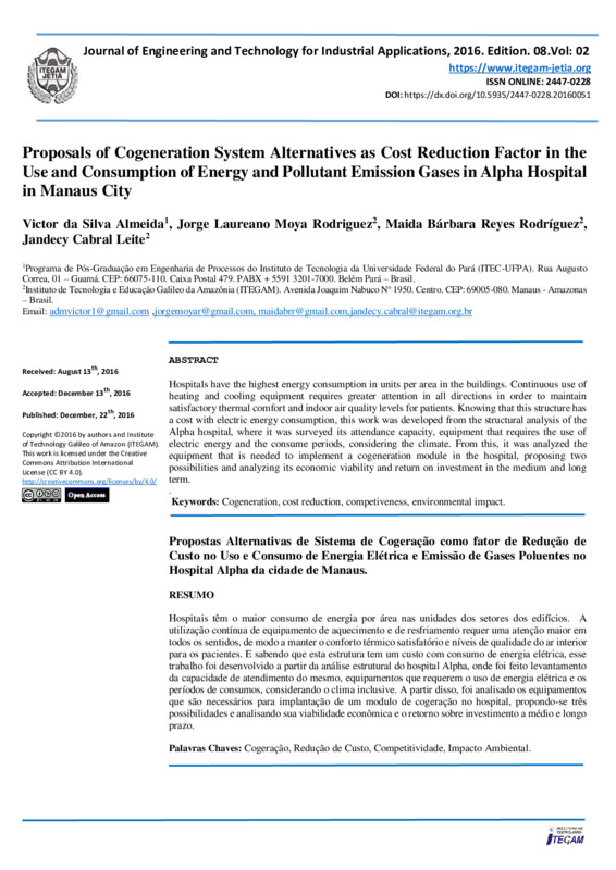 Proposals of Cogeneration System Alternatives as Cost Reduction Factor in the Use and Consumption of Energy and Pollutant Emission Gases in Alpha Hospital in Manaus City