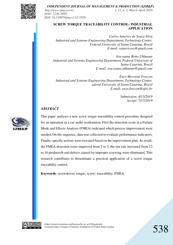 This paper analyses a new screw torque traceability control procedure designed for an operation in a car audio workstation. First the detection score at a Failure Mode and Effects Analysis (FMEA) indicated which process improvement were needed. On the sequence, data was collected to evaluate performance indicators. Finally, specific actions were executed based on the improvement plan. As result, the FMEA detection score improved from 7 to 3, the run rate increased from 12 to 16 products/h and defects caused by improper screwing were eliminated. This research contributes to disseminate a practical application of a screw torque traceability control.