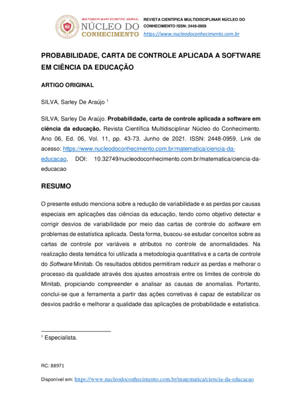 PROBABILIDADE, CARTA DE CONTROLE APLICADA A SOFTWARE EM CIÊNCIA DA EDUCAÇÃO