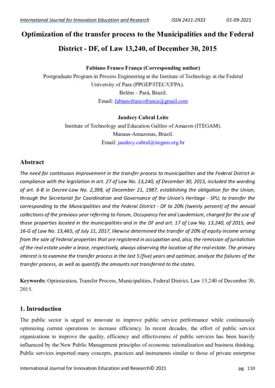 Optimization of the transfer process to the Municipalities and the Federal District - DF, of Law 13,240, of December 30, 2015