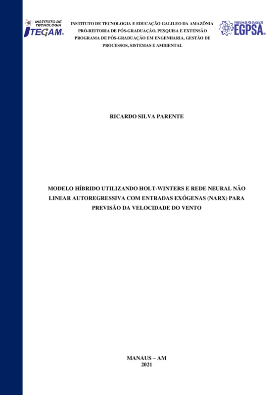 MODELO HÍBRIDO UTILIZANDO HOLT-WINTERS E REDE NEURAL NÃO LINEAR AUTOREGRESSIVA COM ENTRADAS EXÓGENAS (NARX) PARA PREVISÃO DA VELOCIDADE DO VENTO