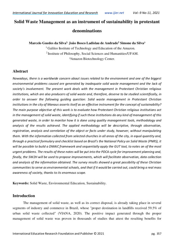Nowadays, there is a worldwide concern about issues related to the environment and one of the biggest environmental problems caused are generated by inadequate solid waste management and the lack of society's involvement. The present work deals with the management in Protestant Christian religious institutions, which are also producers of solid waste and, therefore, deserve to be studied scientifically, in order to answer the following guiding question: Solid waste management in Protestant Christian institutions in the city of Manaus asserts itself as an effective instrument for the concept of sustainability? The main purpose objective of this work is to evaluate how Protestant Christian religious institutions act in the management of solid waste, identifying if such these institutions do any kind of management of this generated waste, in order to monitor how it is done using quality management tools, methodology and analysis of the results achieved. The applied methodology will be descriptive, through observation, registration, analysis and correlation of the object or facts under study, however, without manipulating them. With the information collected from selected churches in all areas of the city, in equal quantity and, through a practical formulary and checklist based on Brazil’s the National Policy on Solid Waste (PNRS), it will be possible to build a DMAIC framework and sequentially apply the GUT tool, to notes on of the most urgent problems. The results of these notes will be put into the PDCA cycle for improvement planning and, finally, the 5W2H will be used to propose improvements, which will facilitate observation, data collection and analysis of the information obtained. The survey results showed a great possibility of these Christian communities to serve as environmental schools, and that if it would be carried out, could bring a real mass awareness of society, thanks to its enormous scope.