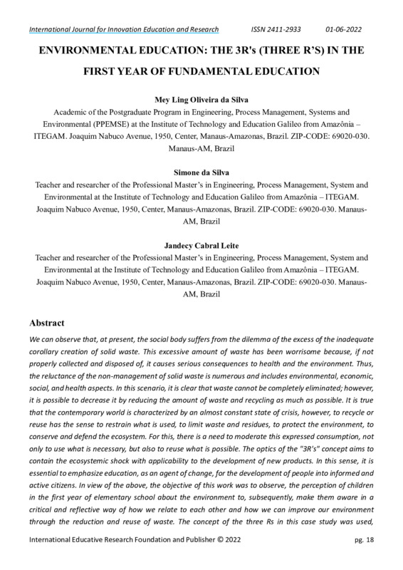 We can observe that, at present, the social body suffers from the dilemma of the excess of the inadequate corollary creation of solid waste. This excessive amount of waste has been worrisome because, if not properly collected and disposed of, it causes serious consequences to health and the environment. Thus, the reluctance of the non-management of solid waste is numerous and includes environmental, economic, social, and health aspects. In this scenario, it is clear that waste cannot be completely eliminated; however, it is possible to decrease it by reducing the amount of waste and recycling as much as possible. It is true that the ontemporary world is characterized by an almost constant state of crisis, however, to recycle or reuse has the sense to restrain what is used, to limit waste and residues, to protect the environment, to conserve and defend the ecosystem. For this, there is a need to moderate this expressed consumption, not only to use what is necessary, but also to reuse what is possible. The optics of the "3R's" concept aims to contain the ecosystemic shock with applicability to the development of new products. In this sense, it is essential to emphasize education, as an agent of change, for the development of people into informed and active citizens. In view of the above, the objective of this work was to observe, the perception of children in the first year of elementary school about the environment to, subsequently, make them aware in a critical and reflective way of how we relate to each other and how we can improve our environment through the reduction and reuse of waste. The concept of the three Rs in this case study was used therefore, to clarify and promote reflection regarding excessive shopping, the reuse of what would go to waste such as cans, cardboard, bottles among others, and finally, to offer the possibility of converting items no longer used into other creations. This study contributed to the awareness and preservation of the environment and its didactic-pedagogical sequence promoted progression in the visuomotor, motor, motor, playful, affective, and critical-reflexive aspects, for the promotion of the acquisition and strengthening of competencies and skills.
