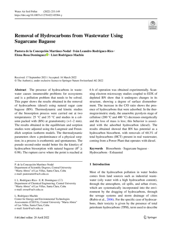and is a pollution problem that needs to be solved. This paper shows the results obtained in the removal of hydrocarbons (diesel) using natural sugar cane bagasse (BN). Thermodynamic and kinetic studies of the biosorption process were carried out at two temperatures: 25 °C and 35 °C and studies in a column packed with (BN) at granulometry (+1–2 mm). The results obtained in the equilibrium and sorption studies were adjusted using the Langmuir and Freundlich sorption isotherm models. The thermodynamic parameters show a predominance of a physical sorption; in a process is exothermic and spontaneous. The pseudo second-order model better fts the kinetics of hydrocarbon biosorption with natural bagasse (R2 ≥ 0.98). The rupture curve where the point is reached 6 h of operation was obtained experimentally. Scanning electron microscopy studies coupled to EDX of depleted BN show that it undergoes changes in its structure, showing a degree of surface dismemberment. The increase in the C/O ratio shows the presence of hydrocarbons that were adsorbed. In the thermogravimetric study, the anaerobic pyrolysis stage of cellulose (200 °C and 400 °C) decreases energetically and the loss of mass is less; this behavior is associated with the adsorbed hydrocarbon (diesel). The results obtained showed that BN has potential as a hydrocarbon biosorbent, with removals of 60.3% of total hydrocarbons (HCT) present in real wastewater, coming from a Power Plant that operates with diesel .