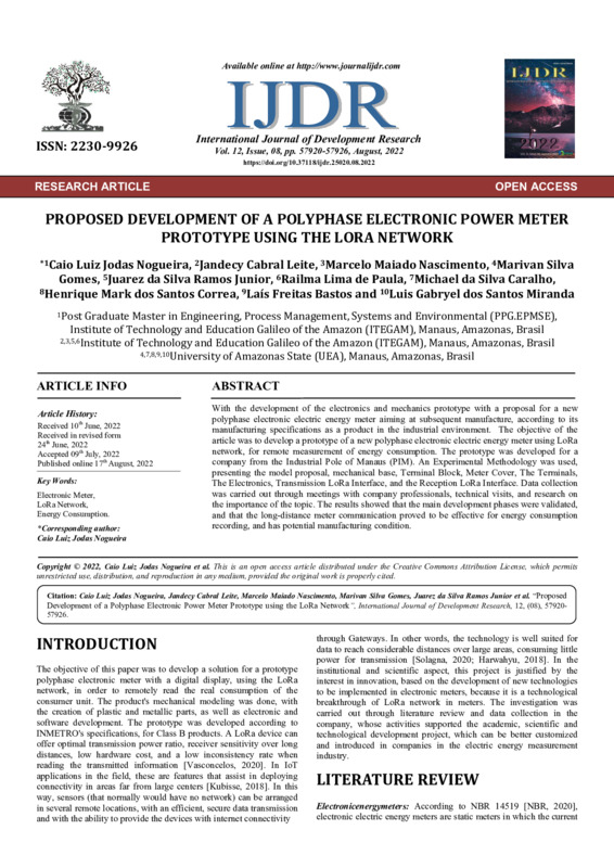 With the development of the electronics and mechanics prototype with a proposal for a new polyphase electronic electric energy meter aiming at subsequent manufacture, according to its manufacturing specifications as a product in the industrial environment. The objective of the article was to develop a prototype of a new polyphase electronic electric energy meter using LoRa network, for remote measurement of energy consumption. The prototype was developed for a company from the Industrial Pole of Manaus (PIM). An Experimental Methodology was used, presenting the model proposal, mechanical base, Terminal Block, Meter Cover, The Terminals, The Electronics, Transmission LoRa Interface, and the Reception LoRa Interface. Data collection was carried out through meetings with company professionals, technical visits, and research on the importance of the topic. The results showed that the main development phases were validated, and that the long-distance meter communication proved to be effective for energy consumption recording, and has potential manufacturing condition.