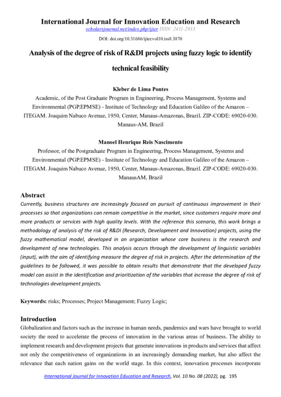 ANALYSIS OF THE DEGREE OF RISK OF R&DI PROJECTS USING FUZZY LOGIC TO IDENTIFY TECHNICAL FEASIBILITY