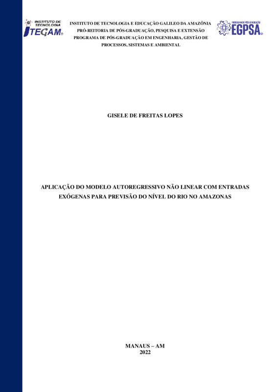 de decisão. Os impactos ambientais causados por fatores econômicos e sociais são problemas retratados em cenários como enchentes e vazantes de rios, trazendo à tona situações como aumento de doenças, redução da produção agrícola em locais que dependem de controle geológico preciso, além do aumento em processos erosivos. em locais de risco. Assim, a utilização da IA para prever o nível do rio, que consequentemente pode minimizar os problemas decorrentes de enchentes que causam impacto ambiental, é altamente possível, pois quando se sabe antecipadamente que um evento está próximo de acontecer, as decisões podem ser tomadas que os impactos sejam menores. Este trabalho modela e aplica o NARX para prever o nível do rio na Amazônia com variáveis de fácil acesso e implementação através do software MATLAB, a fim de contribuir com um modelo de previsão capaz de prever uma possível enchente a partir do nível do rio. Para aplicação da metodologia utilizou-se a base de dados as variáveis de entrada do Instituto Nacional de Meteorologia, e variável de saída do site do Porto de Manaus, estação do Rio Negro do porto de Manaus, 31/01/2020 a 30/06/2021. O desempenho dos modelos foi comparado com 5, 10, 15, 20 e 25 passos para frente, considerando meses como horizonte de previsão. O modelo NARX obteve melhor resposta nas previsões dentre as quais destacou-se o horizonte de 15 passos.