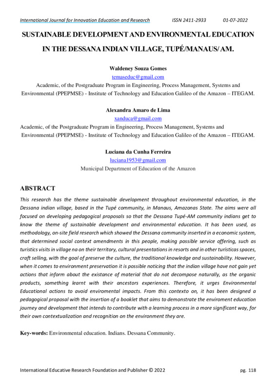 This research has the theme sustainable development throughout environmental education, in the Dessana indian village, based in the Tupé community, in Manaus, Amazonas State. The aims were all focused on developing pedagogical proposals so that the Dessana Tupé-AM community indians get to know the theme of sustainable development and environmental education. It has been used, as methodology, on-site field research which showed the Dessana community inserted in a economic system, that determined social context amendments in this people, making possible service offering, such as turistics visits in village na on their territory, cultural presentations in resorts and in other turísticas spaces, craft selling, with the goal of preserve the culture, the traditional knowledge and sustainability. However, when it comes to environment preservation it is possible noticing that the indian village have not gain yet actions that inform about the existance of material that do not decompose naturally, as the organic products, something learnt with their ancestors experiences. Therefore, it urges Environmental Educational actions to avoid enviromental impacts. From this contexto on, it has been designed a pedagogical proposal with the insertion of a booklet that aims to demonstrate the enviroment education journey and development that intends to contribute with a learning process in a more significant way, for their own contextualization and recognition on the environment they are.