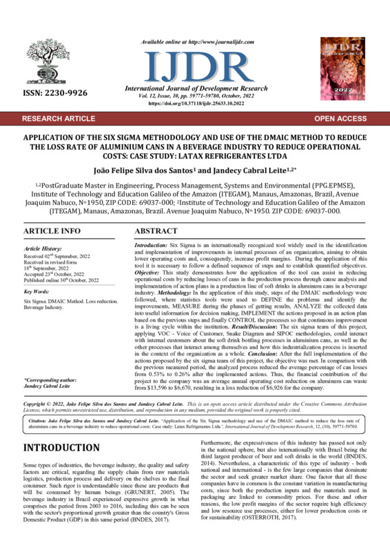 APPLICATION OF THE SIX SIGMA METHODOLOGY AND USE OF THE DMAIC METHOD TO REDUCE THE LOSS RATE OF ALUMINIUM CANS IN A BEVERAGE INDUSTRY TO REDUCE OPERATIONAL COSTS: CASE STUDY: LATAX REFRIGERANTES LTDA