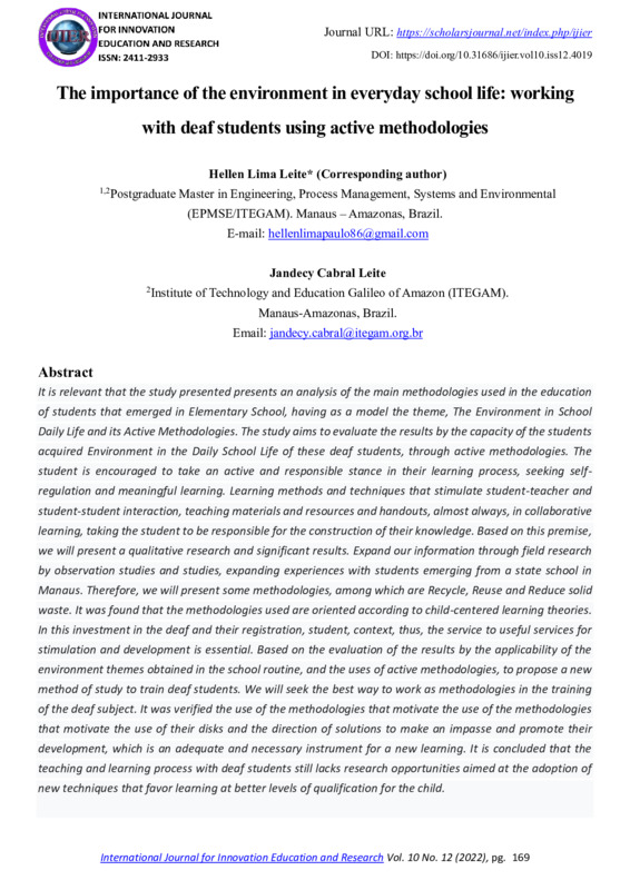 It is relevant that the study presented presents an analysis of the main methodologies used in the education of students that emerged in Elementary School, having as a model the theme, The Environment in School Daily Life and its Active Methodologies. The study aims to evaluate the results by the capacity of the students acquired Environment in the Daily School Life of these deaf students, through active methodologies. The student is encouraged to take an active and responsible stance in their learning process, seeking selfregulation and meaningful learning. Learning methods and techniques that stimulate student-teacher and student-student interaction, teaching materials and resources and handouts, almost always, in collaborative learning, taking the student to be responsible for the construction of their knowledge. Based on this premise, we will present a qualitative research and significant results. Expand our information through field research by observation studies and studies, expanding experiences with students emerging from a state school in Manaus. Therefore, we will present some methodologies, among which are Recycle, Reuse and Reduce solid waste. It was found that the methodologies used are oriented according to child-centered learning theories. In this investment in the deaf and their registration, student, context, thus, the service to useful services for stimulation and development is essential. Based on the evaluation of the results by the applicability of the environment themes obtained in the school routine, and the uses of active methodologies, to propose a new method of study to train deaf students. We will seek the best way to work as methodologies in the training of the deaf subject. It was verified the use of the methodologies that motivate the use of the methodologies that motivate the use of their disks and the direction of solutions to make an impasse and promote their development, which is an adequate and necessary instrument for a new learning. It is concluded that the teaching and learning process with deaf students still lacks research opportunities aimed at the adoption of new techniques that favor learning at better levels of qualification for the child.