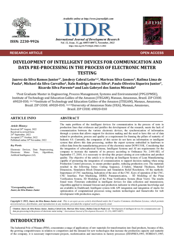 The main problem of the intelligent devices for communication in the process of tests in production lines that evidences and justifies the development of the research, meets the lack of communication between the various electronic devices, the synchronization of information through a system that allows support for decision making and the need to have this set of data related to production, process and quality as a requirement for framing the pillars of maturity of Industry 4.0. Currently, the companies of this sector do not have an information or intelligent system that allows this data processing, neither the expert systems embedded in hardware to collect data from the manufacturing process of the electronic meter DOW1310L. Considering that the integration of cyber-physical Systems, Intelligent Systems and AI are requirements for the company to increase the maturity of its process according to Ordinance No. 2.091-SEI, of September 17, 2018, it is necessary to develop this project aiming at cost reduction and product quality. The objective of the article is to develop an Intelligent System of Lean Manufacturing capable of promoting the integration of communication to support decision making when using Production Control processes, to ensure product quality, reducing production cost. The materials resulted in the following forms: Cutting Sequence, Z-Safety, Material Thickness, Relief Dimension, Simulation Block Dimensions and Simulation Relief Resolution. Of the methods: Importance of CNC machining, Indication of the axes of the CNC. Keys of operation of the CNC, CNC Interface. Part Machining, DERD, Parameterization, - 3D Modeling of the Pima Verification System, 3D Modeling of the Pima Verification System (Rear View). The results found were: Firmware embedded in intelligent devices for data collection and transmission; Algorithm applied to demand forecast and production indicator in which generate knowledge and are available in Dashboard; Intelligent system with API integration and integration of stacks for optimization of computational processes using modern technologies and frameworks for web development with production engines.