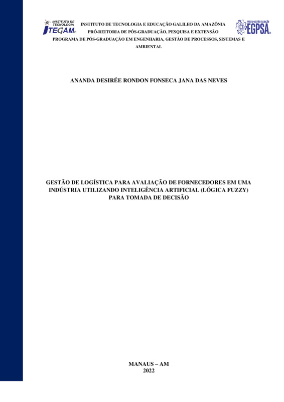 GESTÃO DE LOGÍSTICA PARA AVALIAÇÃO DE FORNECEDORES EM UMA INDÚSTRIA UTILIZANDO INTELIGÊNCIA ARTIFICIAL (LÓGICA FUZZY) PARA TOMADA DE DECISÃO.