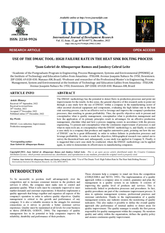 The DMAIC methodology has the potential to detect flaws in production processes and point out improvements for the results. In this sense, the general objective of this research seeks to point out through a case study how the use of DMAIC within a company in the manufacturing sector of other assorted electrical equipment and components, evaluating the high failure rate in the heat sink screwing process, can be an effective tool to leverage and improve the processes, thus resulting in greater profitability. Thus, the specific objectives seek to present and conceptualize what is quality management, conceptualize what is production management and how the application of its primary principles result in advantages for an effective production management, elucidate what and how a process mapping occurs in accordance with the process engineering, To present and conceptualize what the continuous improvement of processes is and