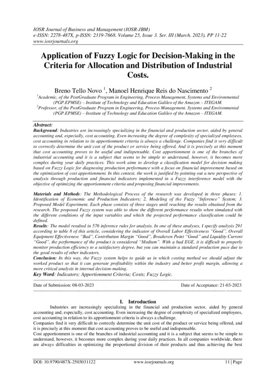 Background: Industries are increasingly specializing in the financial and production sector, aided by general accounting and, especially, cost accounting. Even increasing the degree of complexity of specialized employees, cost accounting in relation to its apportionment criteria is always a challenge. Companies find it very difficult to correctly determine the unit cost of the product or service being offered. And it is precisely at this moment that cost accounting proves to be useful and indispensable. Cost apportionment is one of the branches of industrial accounting and it is a subject that seems to be simple to understand, however, it becomes more complex during your daily practices. This work aims to develop a classification model for decision making based on Fuzzy Logic for diagnosing production performance with a focus on financial improvement based on the optimization of cost apportionment. In this context, the work is justified by pointing out a new perspective of analysis through production and financial indicators implemented in a Fuzzy interference model with the objective of optimizing the apportionment criteria and proposing financial improvements. Materials and Methods: The Methodological Process of the research was developed in three phases: 1. Identification of Economic and Production Indicators; 2. Modeling of the Fuzzy “Inference” System; 3. Proposed Model Experiment. Each phase consists of three stages until reaching the results obtained from the research. The proposed Fuzzy system was able to show the different performance results when simulated with the different conditions of the input variables and which the projected performance classification could be defined. Results: The model resulted in 576 inference rules for analysis. In one of these analyses, I specify analysis 291 according to table 8 of this article, considering the indicator of Overall Labor Effectiveness “Good”, Overall Equipment Effectiveness “Bad”, Contribution Margin “Good”, Breakeven Point “Good” and Liquidity Current “Good”, the performance of the product is considered “Medium”. With a bad EGE, it is difficult to properly monitor production efficiency to a satisfactory degree, but you can maintain a standard production pace due to