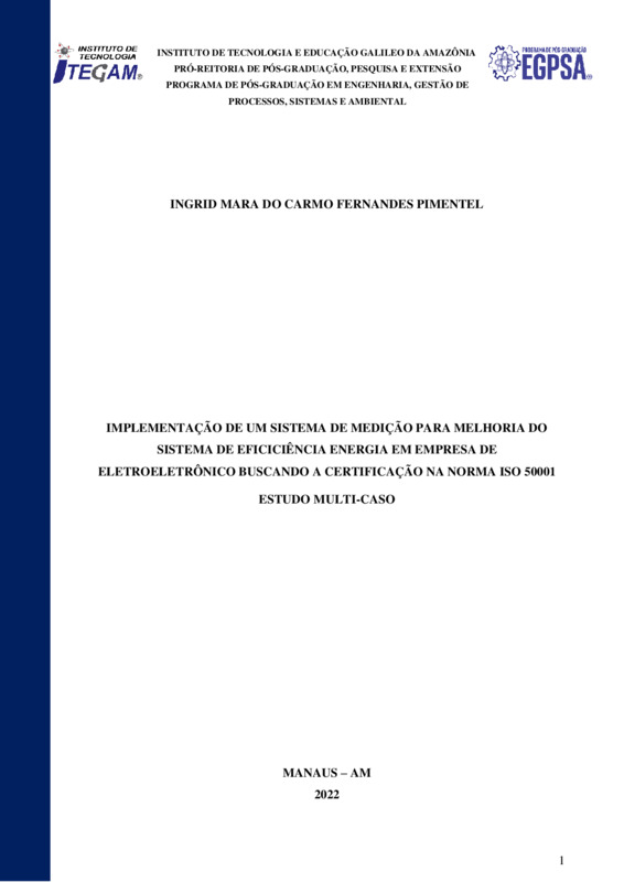 IMPLEMENTAÇÃO DE UM SISTEMA DE MEDIÇÃO PARA MELHORIA DO SISTEMA DE EFICICIÊNCIA ENERGIA EM EMPRESA DE ELETROELETRÔNICO BUSCANDO A CERTIFICAÇÃO NA NORMA ISO 50001 ESTUDO MULTI-CASO