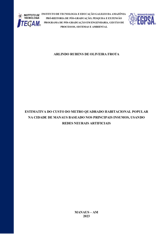 ESTIMATIVA DO CUSTO DO METRO QUADRADO HABITACIONAL POPULAR NA CIDADE DE MANAUS BASEADO NOS PRINCIPAIS INSUMOS, USANDO REDES NEURAIS ARTIFICIAIS