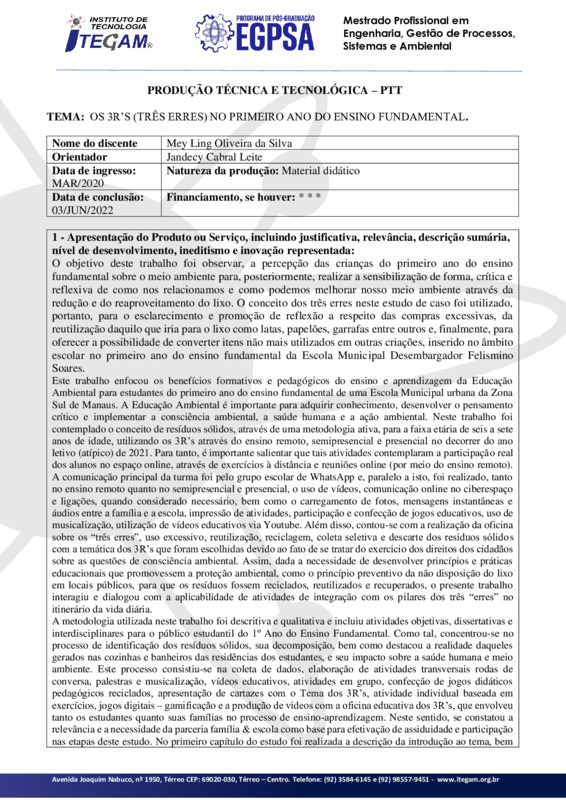 O PTT apresenta a cartilha voltada para aspectos formativos e pedagógicos do ensino e aprendizagem da Educação Ambiental para estudantes do primeiro ano do ensino fundamental de uma Escola Municipal urbana da Zona Sul de Manaus.