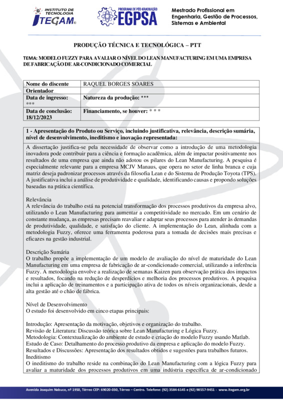 MODELO FUZZY PARA AVALIAR O NÍVEL DO LEAN MANUFACTURING EM UMA EMPRESA DE FABRICAÇÃO DE AR-CONDICIONADO COMERCIAL
