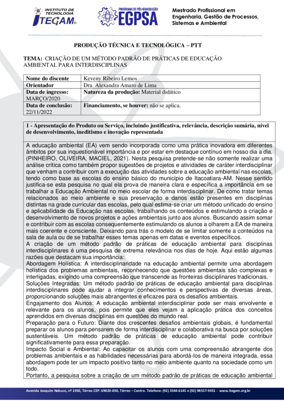 Nesta pesquisa pretende-se não somente realizar uma análise crítica como também propor sugestões de projetos e atividades de caráter interdisciplinar que venham a contribuir com a execução das atividades sobre a educação ambiental nas escolas, tendo como base as escolas do ensino básico do município de Itacoatiara-AM. Nesse sentido justifica-se esta pesquisa no qual ela prova de maneira clara e específica a importância em se trabalhar a Educação Ambiental no meio escolar de forma interdisciplinar. De como tratar temas relacionados ao meio ambiente e sua preservação e danos estão presentes em disciplinas distintas na grade curricular das escolas, pelo qual estima-se criar um método unificado do ensino e aplicabilidade da Educação nas escolas, trabalhando os conteúdos e estimulando a criação e desenvolvimento de novos projetos e ações ambientais junto aos alunos. Buscando assim somar e contribuir com as escolas consequentemente estimulando os alunos a olharem a EA de maneira mais coerente e consciente. Deixando para trás o modelo de se limitar somente a conteúdos na sala de aula ou de se trabalhar esses temas apenas em datas e eventos específicos. A criação de um método padrão de práticas de educação ambiental para disciplinas interdisciplinares é uma pesquisa de extrema relevância nos dias de hoje.