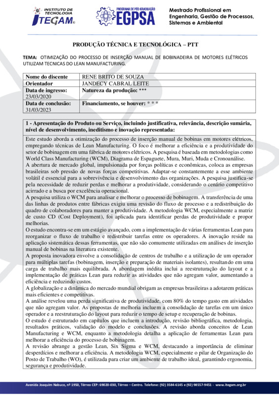 OTIMIZAÇÃO DO PROCESSO DE INSERÇÃO MANUAL DE BOBINADEIRA DE MOTORES ELÉTRICOS UTILIZAM TECNICAS DO LEAN MANUFACTURING