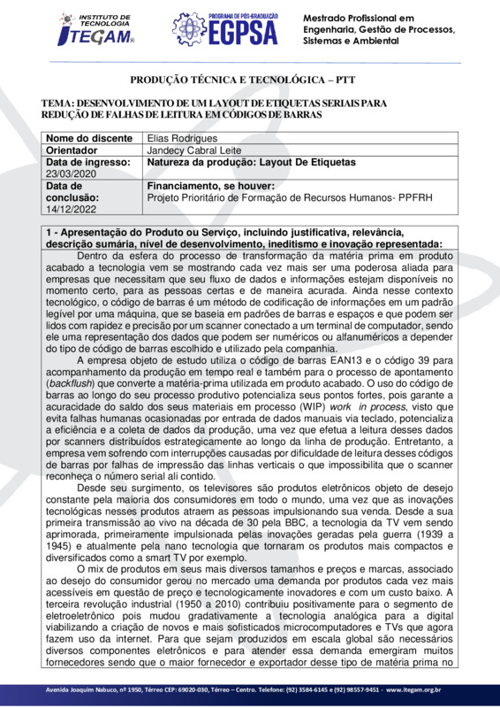 DESENVOLVIMENTO DE UM LAYOUT DE ETIQUETAS SERIAIS PARA REDUÇÃO DE FALHAS DE LEITURA EM CÓDIGOS DE BARRAS