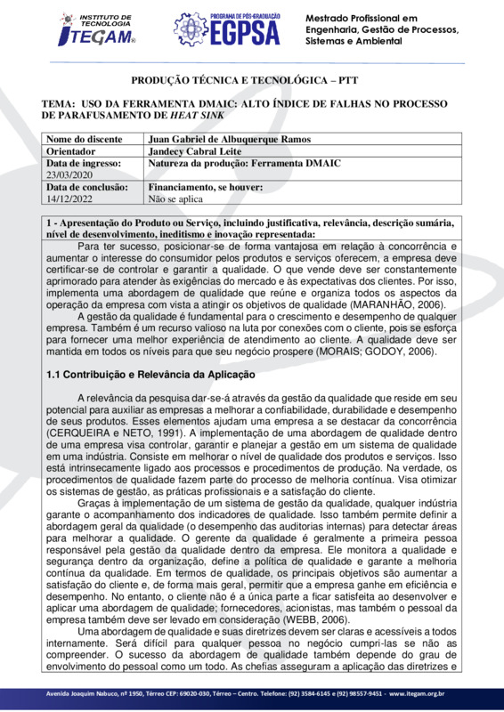 Este estudo se justifica a partir de uma problemática de uma indústria situada em Manaus, que produz placas e painéis de automóveis. Dentre as diversas etapas da produção, a confecção das placas é um item sensível, especialmente quando os componentes eletrônicos mais caros já foram inseridos e a placa precisa receber a inserção de algum elemento mecânico externo. Em nosso caso específico, a placa do painel automotivo recebe, ao final da produção, um dissipador de calor (heat sink), que é uma chapa metálica a ser parafusada na placa. Como já dito, este processo delicado, se for executado sem os cuidados devidos, pode causar a perda da placa inteira. Dentro desta questão, o presente trabalho demonstra, por meio um estudo de caso, dentro de uma empresa do setor de Manufatura do Polo Industrial de Manaus, a eficácia da ferramenta DMAIC na detecção do índice de falhas no processo de parafusamento de heat sink de uma placa de painel automotivo. Pretende-se mostrar que o DMAIC pode ser uma ferramenta eficaz para solução de problemas e melhoria de processos.