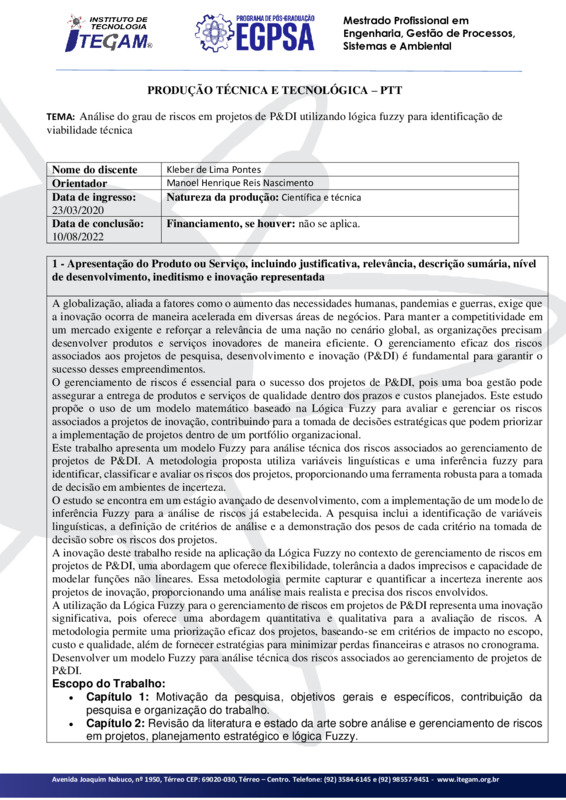 O estudo, baseado na determinação de diretrizes específicas, demonstra que o modelo Fuzzy possui a capacidade de auxiliar na identificação e priorização dos fatores que mais contribuem para o aumento do risco em projetos de desenvolvimento tecnológico. Os resultados obtidos indicam a eficácia do modelo em apoiar a gestão de riscos, promovendo uma abordagem mais precisa e estratégica para a avaliação de viabilidade técnica em projetos de P&DI.