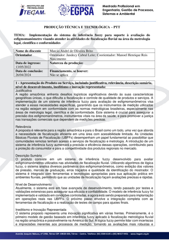 O produto consiste em um sistema de inferência fuzzy desenvolvido para avaliar esfigmomanômetros utilizados nas atividades de fiscalização fluvial. Utilizando algoritmos de lógica fuzzy, o sistema analisa diversos parâmetros dos esfigmomanômetros, como exibição dos valores de pressão, marcas de graduação, erros traçados e qualidade da identificação do mostrador. O sistema é integrado com ferramentas e tecnologias apropriadas para sua aplicação prática em ambientes fluviais, permitindo que as unidades de fiscalização façam avaliações precisas e rápidas. Desenvolvimento de um modelo de inferência fuzzy para capturar e processar a incerteza e subjetividade envolvidas na avaliação dos esfigmomanômetros.