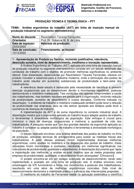 A Análise Ergonômica do Trabalho (AET) aplicada em uma linha de inserção manual de produção industrial no segmento eletroeletrônico consiste em um estudo detalhado das condições de trabalho com o objetivo de promover melhorias significativas no ambiente laboral. Esta dissertação, desenvolvida por Raulchelison Tavares Fernandes, oferece um produto inovador e essencial para a indústria moderna, onde a otimização dos postos de trabalho pode resultar em aumentos substanciais de produtividade e bem-estar dos trabalhadores. O estudo realizado envolveu uma análise detalhada dos postos de trabalho na linha de produção, utilizando técnicas de antropometria para avaliar as medidas físicas dos trabalhadores. A partir dessas análises, foram implementadas diversas melhorias ergonômicas, como ajustes no mobiliário e na disposição dos postos de trabalho. Estas alterações foram monitoradas e avaliadas, resultando em melhorias significativas nos indicadores de produtividade, qualidade e absenteísmo. A dissertação documenta que "após a implantação das melhorias, a análise ex-post mostrou que as metas propostas pela empresa de produtividade, qualidade, e absenteísmo foram alcançadas"【3†source】. O projeto encontra-se em um estágio avançado de desenvolvimento, tendo sido implementado e avaliado em uma linha de produção real. A análise envolveu uma amostragem de 375 funcionários e focou nos movimentos e posturas dos trabalhadores, resultando em uma série de melhorias ergonômicas concretas. Este nível de desenvolvimento demonstra a viabilidade prática e a eficácia das intervenções propostas. O ineditismo do trabalho de Fernandes reside na aplicação sistemática e científica da AET em um ambiente industrial específico, o segmento eletroeletrônico. A inovação está na integração detalhada de dados antropométricos e ergonômicos para adaptar postos de trabalho a uma ampla variedade de biótipos, algo que não é comumente realizado com tal nível de precisão e rigor. A dissertação destaca que "a análise acurada dos diversos segmentos é feita segundo as técnicas da antropometria, que é o estudo das medidas físicas do corpo humano, uma abordagem que oferece uma nova perspectiva sobre a ergonomia aplicada.