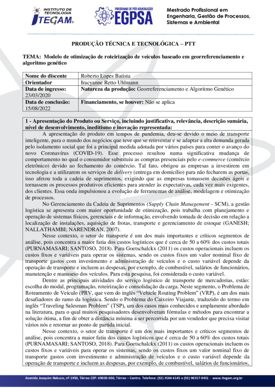 Modelo de otimização de roteirização de veículos baseado em georreferenciamento e algoritmo genético