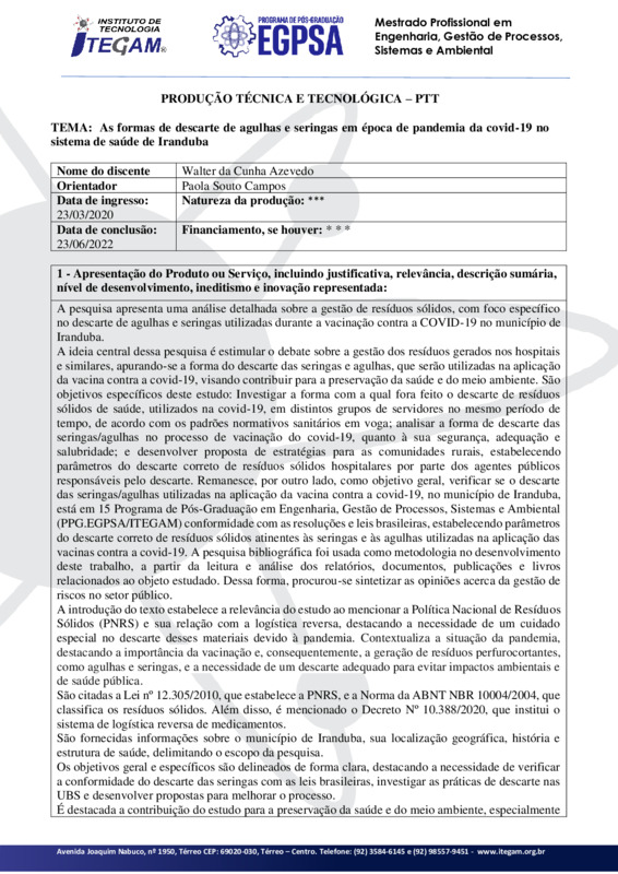 As formas de descarte de agulhas e seringas em época de pandemia da covid-19 no sistema de saúde de Iranduba