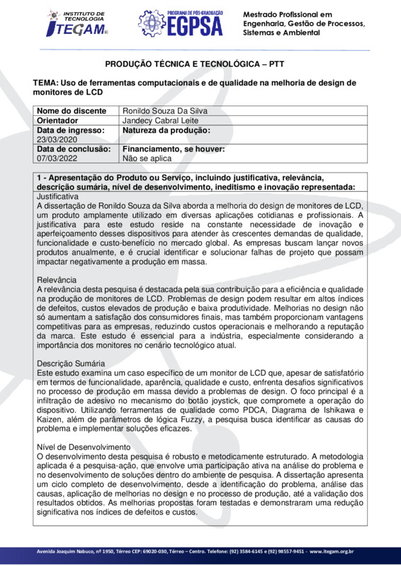 Este estudo examina um caso específico de um monitor de LCD que, apesar de satisfatório em termos de funcionalidade, aparência, qualidade e custo, enfrenta desafios significativos no processo de produção em massa devido a problemas de design. O foco principal é a infiltração de adesivo no mecanismo do botão joystick, que compromete a operação do dispositivo. Utilizando ferramentas de qualidade como PDCA, Diagrama de Ishikawa e Kaizen, além de parâmetros de lógica Fuzzy, a pesquisa busca identificar as causas do problema e implementar soluções eficazes.