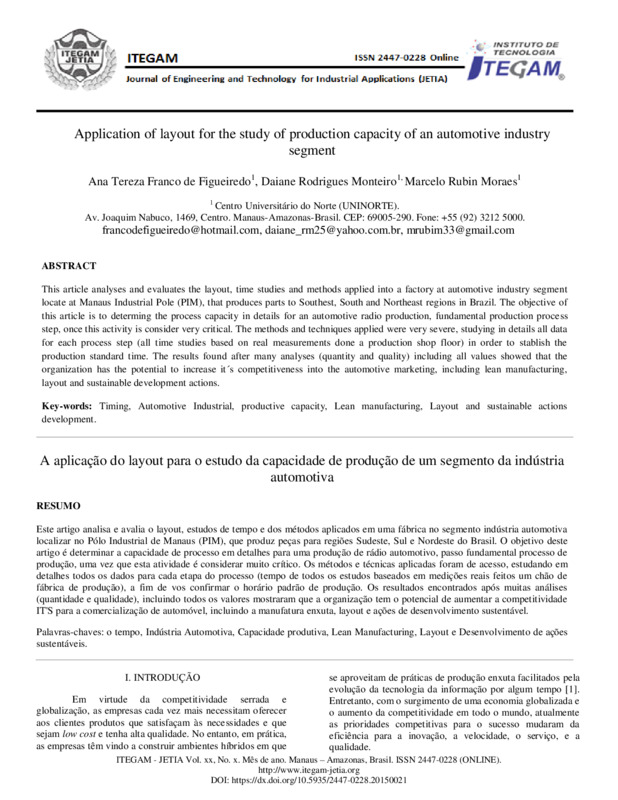 Este artigo analisa e avalia o layout, estudos de tempo e dos métodos aplicados em uma fábrica no segmento indústria automotiva localizar no Pólo Industrial de Manaus (PIM), que produz peças para regiões Sudeste, Sul e Nordeste do Brasil. O objetivo deste artigo é determinar a capacidade de processo em detalhes para uma produção de rádio automotivo, passo fundamental processo de produção, uma vez que esta atividade é considerar muito crítico. Os métodos e técnicas aplicadas foram de acesso, estudando em detalhes todos os dados para cada etapa do processo (tempo de todos os estudos baseados em medições reais feitos um chão de fábrica de produção), a fim de vos confirmar o horário padrão de produção. Os resultados encontrados após muitas análises (quantidade e qualidade), incluindo todos os valores mostraram que a organização tem o potencial de aumentar a competitividade IT'S para a comercialização de automóvel, incluindo a manufatura enxuta, layout e ações de desenvolvimento sustentável.