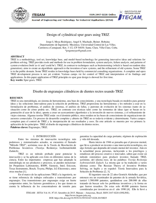 TRIZ es una metodología, un sistema de herramientas, una base de conocimiento, y una tecnología basada en modelos para generar ideas y las soluciones innovadoras para la solución de problemas. TRIZ proporciona las herramientas y los métodos a usar en la formulación de problemas, el análisis de sistemas, el análisis de fallas, y patrones de evolución de los sistemas (tanto de su situación como de cómo podría ser.. TRIZ, en contraste con técnicas tales como las tormentas de ideas (que se basan en la generación al azar de la idea), apunta a crear un acercamiento algorítmico a la invención de nuevos sistemas, y el refinamiento de viejos sistemas. Algunas teorías TRIZ están en el dominio público, otras residen en las bases de conocimiento de organizaciones de asesores comerciales. Un proceso de desarrollo completo y abierto de TRIZ no es todavía evidente y determinante. Varios campos compiten para el control de TRIZ y la interpretación de sus resultados y usos. En este artículo se muestra por vez primera la aplicación de los principios TRIZ al diseño de engranajes cilíndricos de dientes rectos.