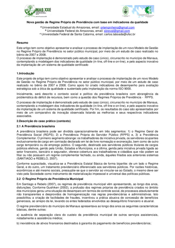 Este artigo tem como objetivo apresentar e analisar o processo de implantação de um novo Modelo de Gestão no Regime Próprio de Previdência no setor público municipal, por meio de um estudo de caso realizado no biênio de 2007 e 2008.O processo de implantação é demonstrado pelo estudo de caso (único), circunscrito no município de Manaus, contemplando a modelagem dos indicadores de qualidade (in-line, off-line e on-line), e pelo aspecto inovativo da implantação de um sistema de qualidade certificado