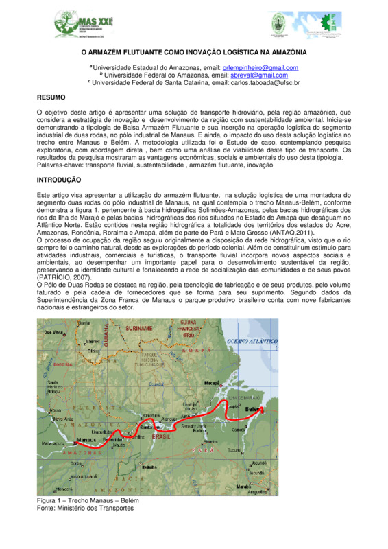 O objetivo deste artigo é apresentar uma solução de transporte hidroviário, pela região amazônica, que considera a estratégia de inovação e desenvolvimento da região com sustentabilidade ambiental. Inicia-se demonstrando a tipologia de Balsa Armazém Flutuante e sua inserção na operação logística do segmento industrial de duas rodas, no pólo industrial de Manaus. E ainda, o impacto do uso desta solução logística no trecho entre Manaus e Belém. A metodologia utilizada foi o Estudo de caso, contemplando pesquisa exploratória, com abordagem direta , bem como uma análise de viabilidade deste tipo de transporte. Os resultados da pesquisa mostraram as vantagens econômicas, sociais e ambientais do uso desta tipologia.
